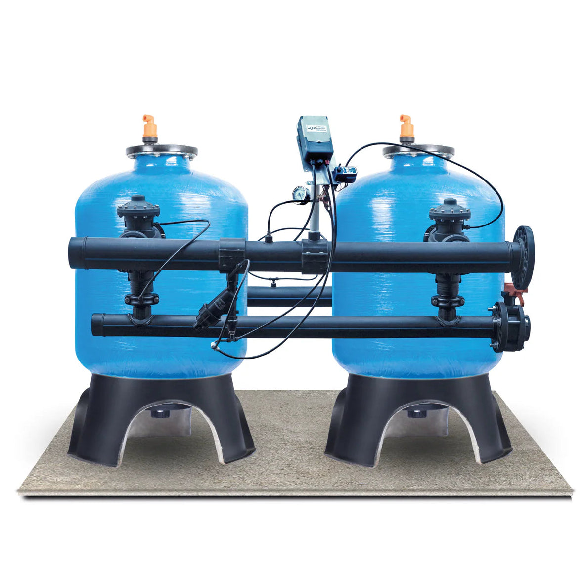 Sistema de filtración automática compuesto por cuatro estanques de arena de 30", diseñado para proyectos agrícolas de alto caudal y grandes extensiones. El retrolavado automático accionado por programador DC + 220V permite operación continua y máxima protección del sistema de riego.