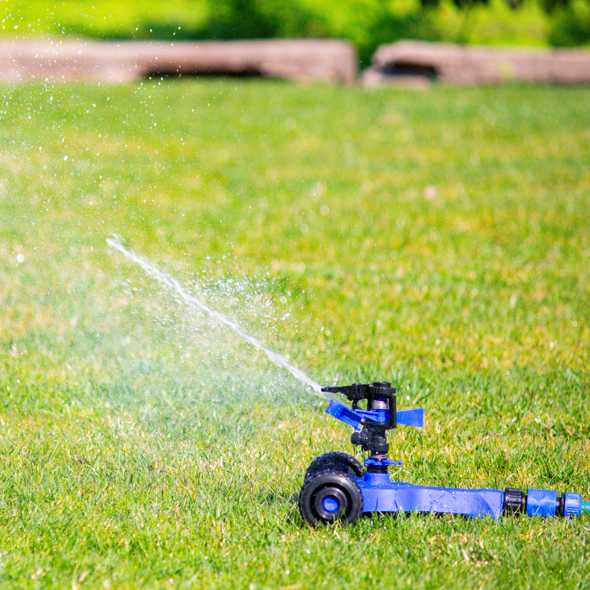 Aspersor giratorio de 360° con base móvil, ideal para el riego uniforme de jardines, áreas verdes y césped. Su base con ruedas facilita el desplazamiento, permitiendo cubrir distintas zonas sin esfuerzo y garantizando una distribución homogénea del agua.